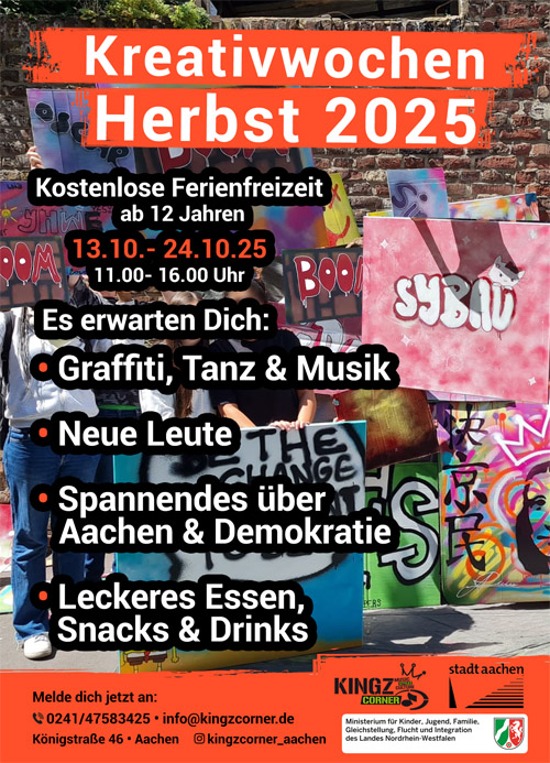 Homeweb5482025-09-24T10:50:49+02:00 Willkommen im soziokulturellen Jugend- und Medienzentrum KingzCorner Aachen! Zurück Weiter Förderer & Partner Zurück Weiter Zurück Weiter